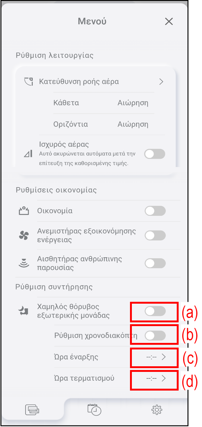 | (d) | Ώρα τερματισμού | Πατήστε για να ρυθμίσετε τον χρόνο λήξης για τον χρονοδιακόπτη Χαμηλού θορύβου εξωτερικής μονάδας. Ο λειτουργία χαμηλού θορύβου της εξωτερικής μονάδας σταματά την καθορισμένη ώρα. |