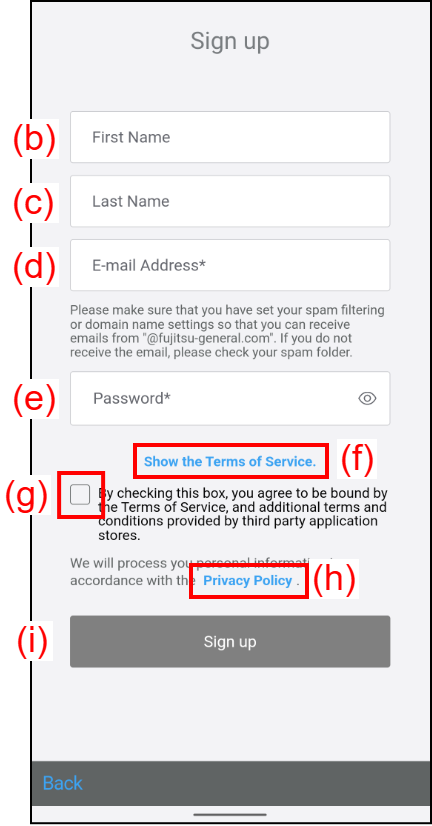 * Use an e-mail address that can be accessed from your smartphone.(e) Password Enter a password of your choice consisting of alphanumeric characters. The password must contain a combination of at least three uppercase letters, lowercase letters, numbers, and symbols.