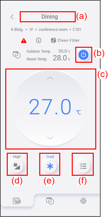 | (f) | Function Menu button | Tap this icon to set the air conditioner's functions. (Refer to "Function settings".) |