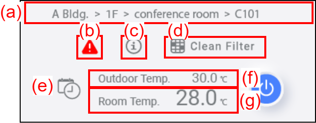 | (a) | Group name | It shows the group name, which includes the air conditioner. If no group is set, this item is not shown. |