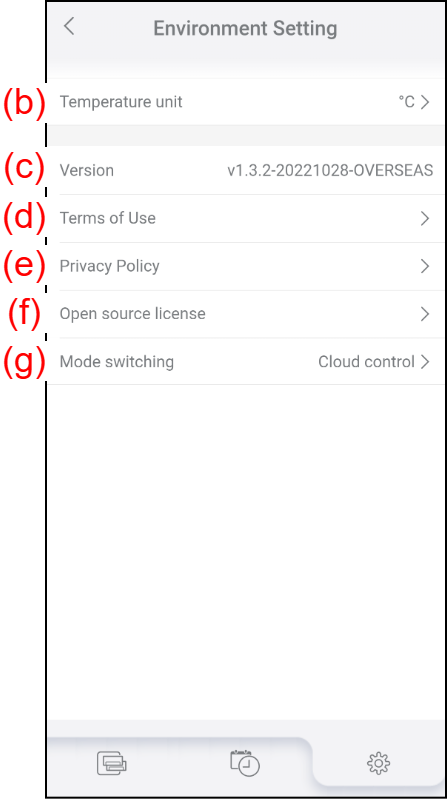 (c) Version It shows the current version of AIRSTAGE Mobile. (d) Terms of Use Tap to check the latest Terms of Use for AIRSTAGE Mobile. (e) Privacy Policy Tap to check the latest Privacy Policy for AIRSTAGE Mobile. (f) Open source license Tap to check the open-source licenses used in AIRSTAGE Mobile. *The open-source licenses are shown only in English. (g) Mode switching Tap to switch the control mode (Cloud control or Direct control.)