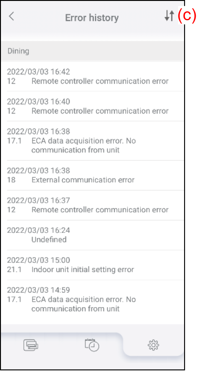- The error history of the air conditioner is shown in order of newest to oldest.