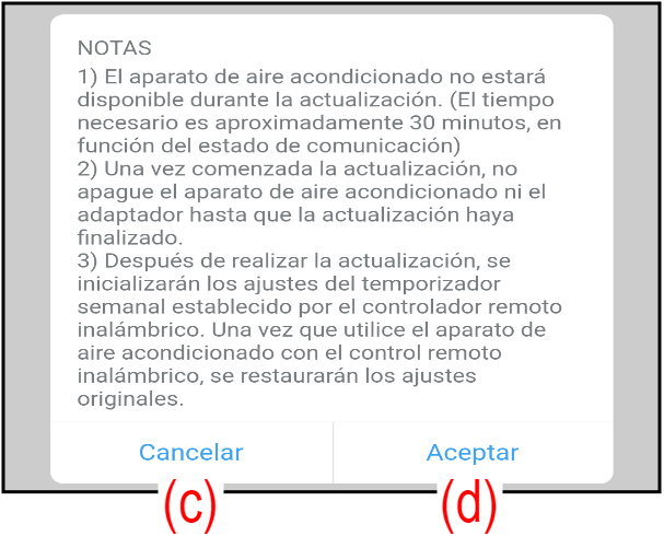 Para cerrar la ventana sin activar la actualización automática del firmware, toque (c).