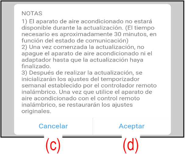 Para cerrar la ventana sin activar la actualización automática del firmware, toque (c).
