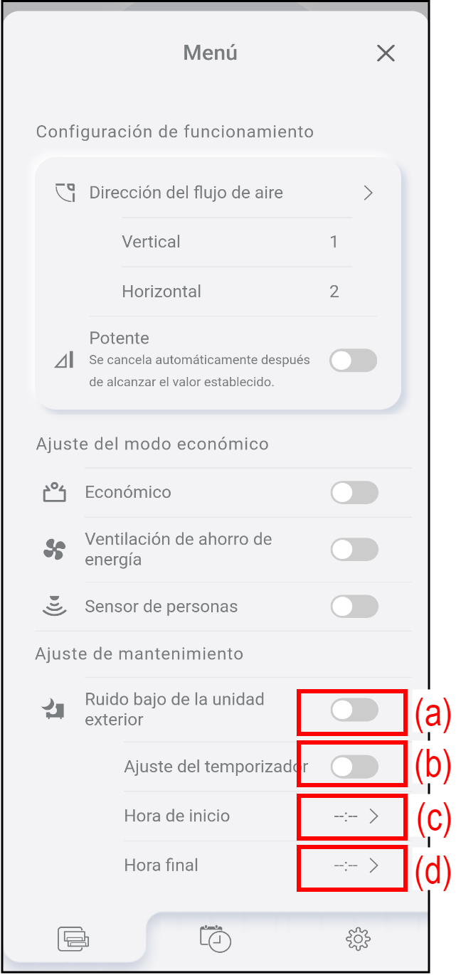 Toque para ajustar la hora de finalización del temporizador de ruido bajo de la unidad exterior.