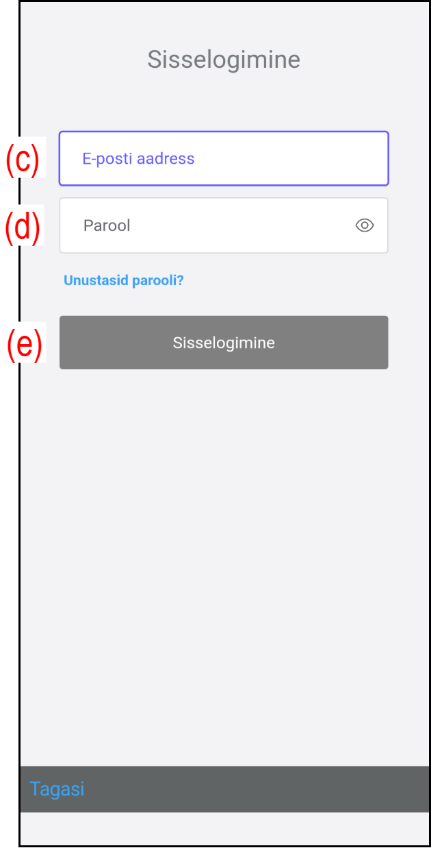 - Logige sisse e-posti aadressi (c) ja parooliga (d), mida kasutasite registreerumisel.