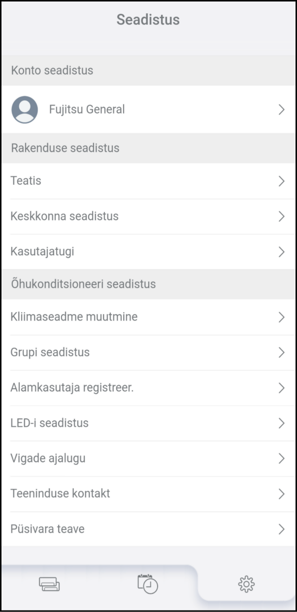 Saate vaadata ja muuta selle rakenduse või kliimaseadmete erinevaid seadeid seadistuse vahekaardil [