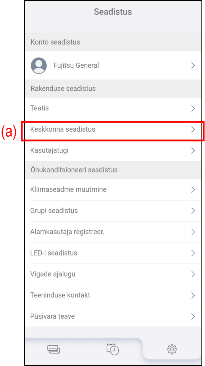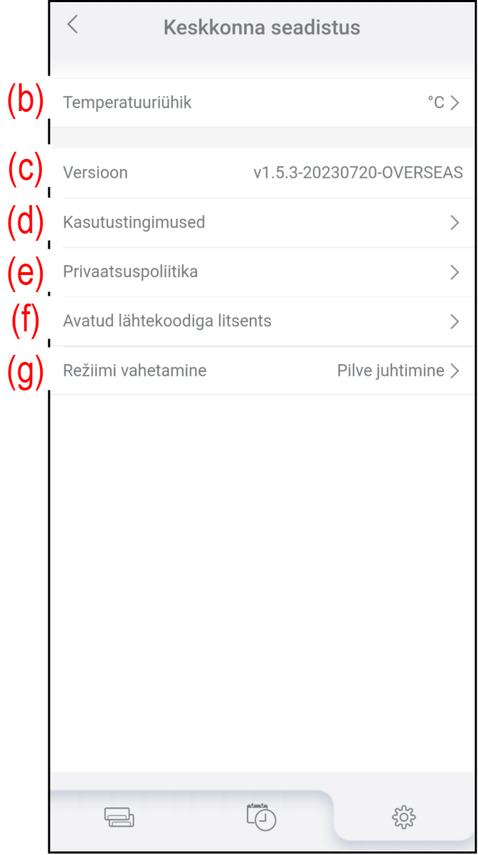 (c) Version See näitab AIRSTAGE Mobile’i praegust versiooni. (d) Terms of Use Puudutage, et vaadata AIRSTAGE Mobile’i uusimaid kasutustingimusi. (e) Privacy Policy Puudutage, et vaadata AIRSTAGE Mobile’i uusimat privaatsuspoliitikat. (f) Open source license Puudutage AIRSTAGE Mobile’is kasutatava avatud lähtekoodiga litsentsi vaatamiseks. * Avatud lähtekoodiga litsents kuvatakse vaid inglise keeles. (g) Mode switching Puudutage juhtimisrežiimi vahetamiseks valikut (Pilvejuhtimine või Otsene juhtimine.)