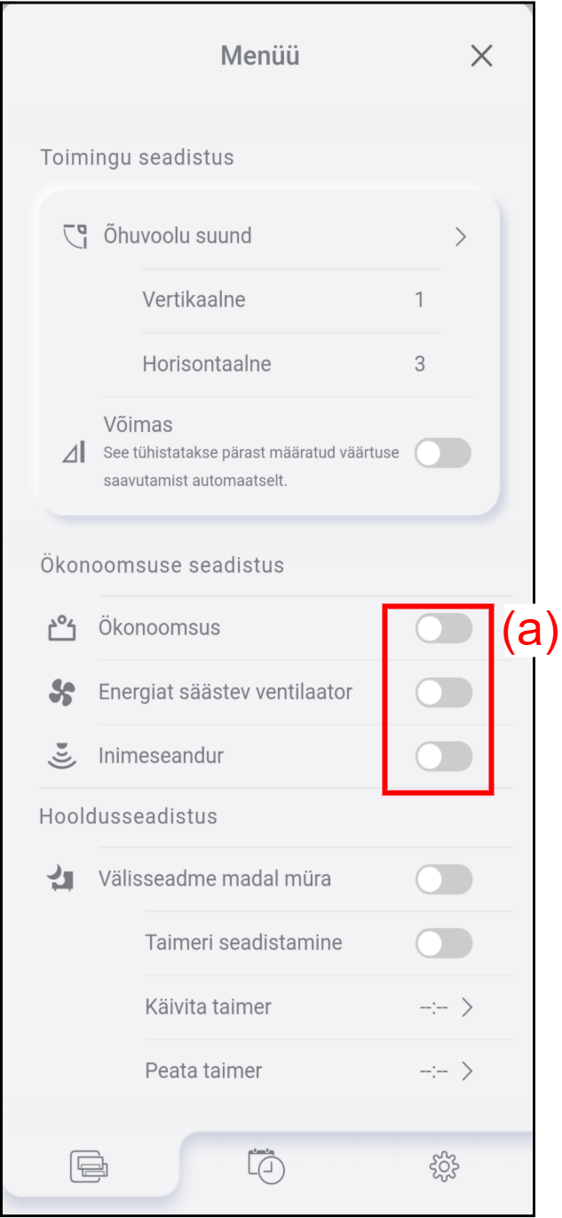 Iga toimingu aktiveerimiseks/desaktiveerimiseks puudutage valikut (a).