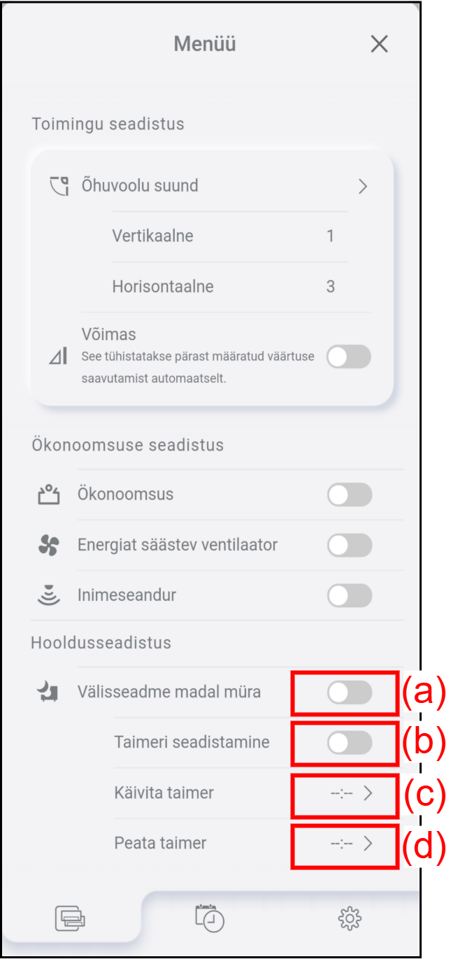 | (c) | Start timer | Puudutage, et määrata välisseadme madala mürataseme taimeri algusaeg. Välisseadme madal müratase käivitub määratud ajal. |