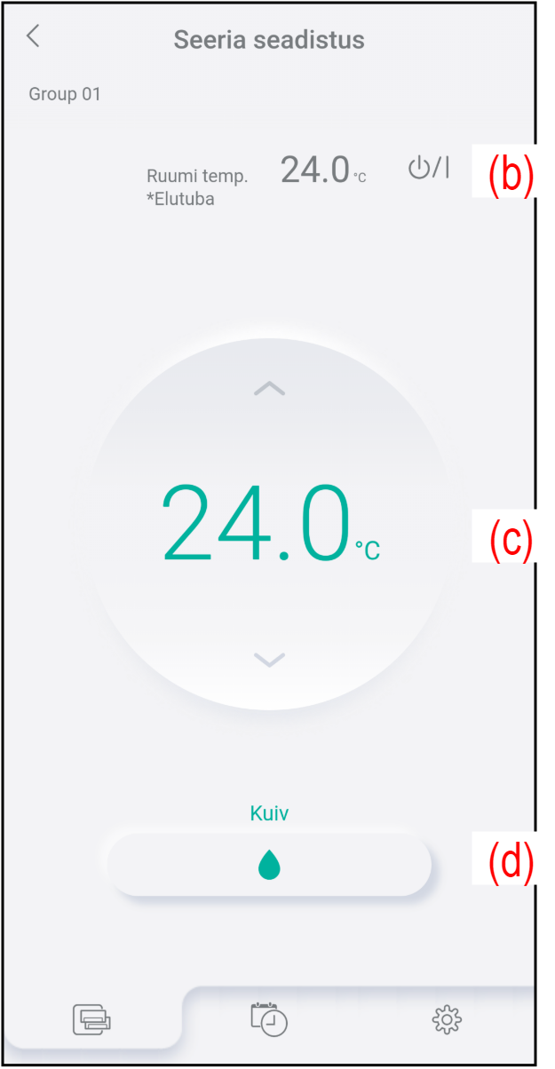 * Režiimis „Fan“ (Ventilaator) ja „Minimaalne küte“ pole see saadaval.(d) Töörežiim Töörežiimi valimiseks puudutage siin. - Akna sulgemiseks puudutage valikut (e).