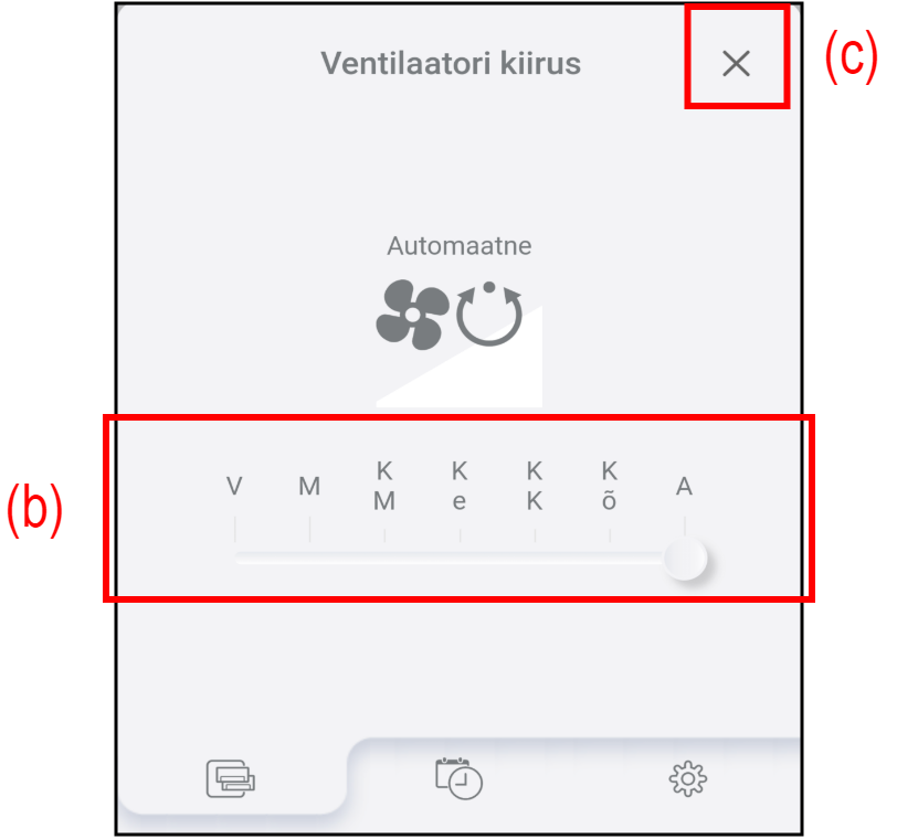 Ventilaatori kiiruse reguleerimiseks kerige riba (b).