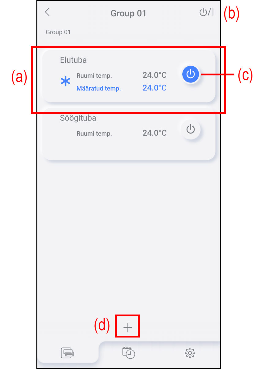 Puudutage (b), et käivitada/peatada kõigi rühmas olevate kliimaseadmete töö. Üksikasju vaadake allpool jaotisest „Kõik käivitus-/peatustoimingud“.