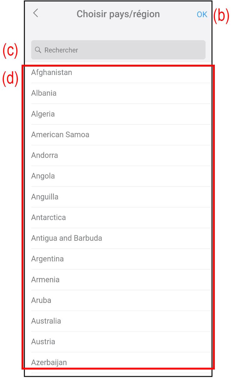 - Sélectionnez votre pays/région dans la liste (d). Vous pouvez rechercher le pays/la région à partir de « Rechercher » (c).