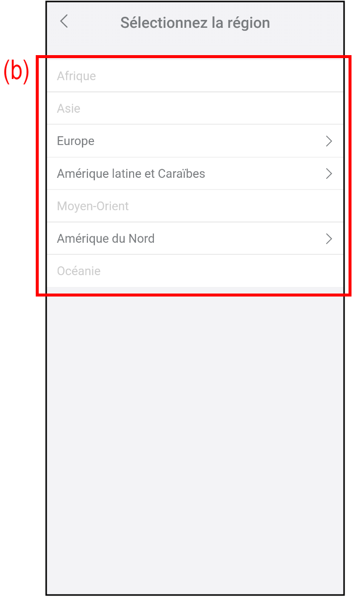 L’écran « Choisir Région » s’affiche. - Sélectionnez votre région dans la liste (a).