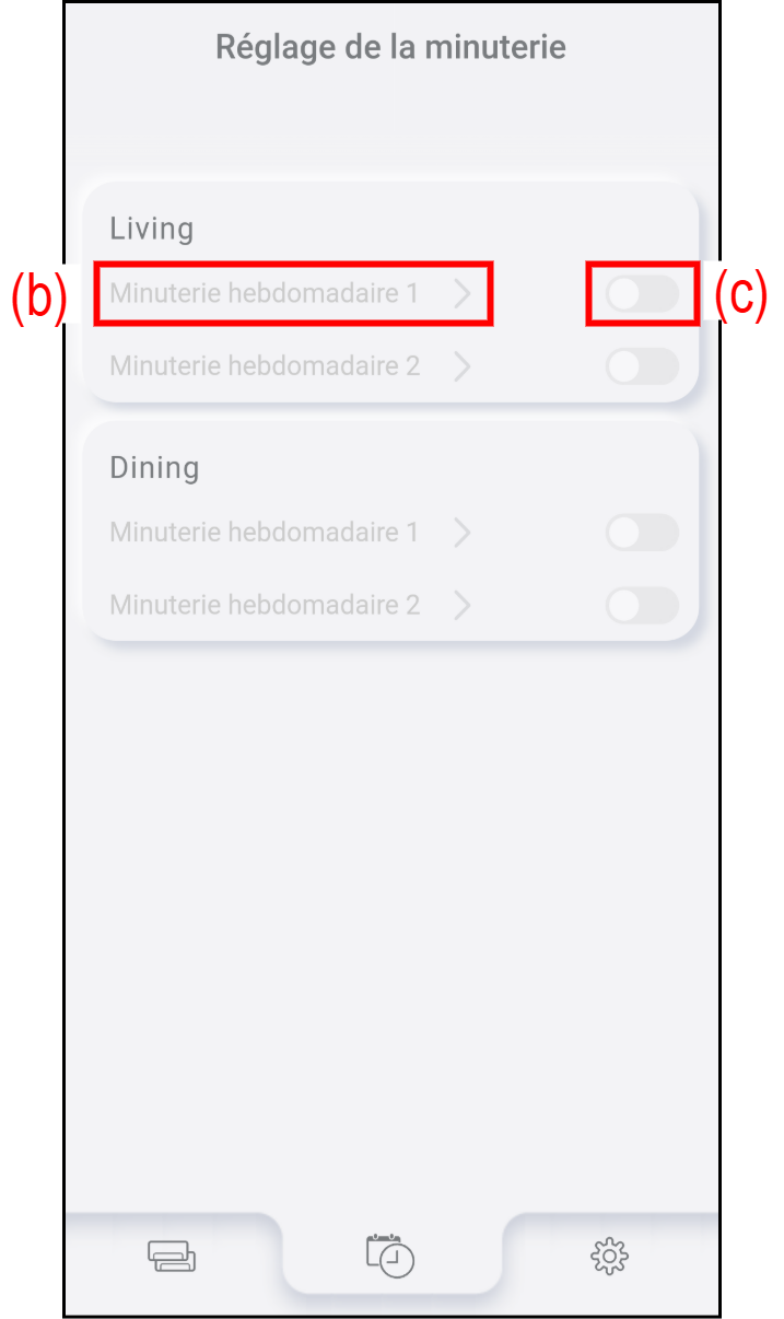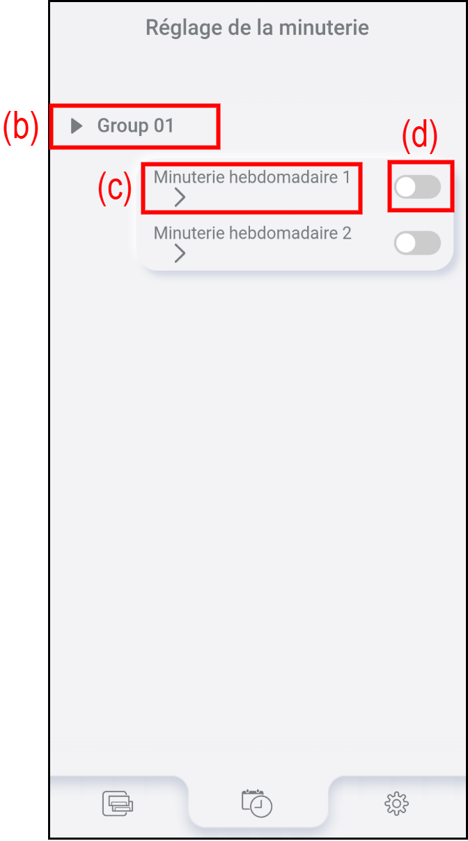 Appuyez sur (c) pour activer/désactiver la minuterie Hebdomadaire.