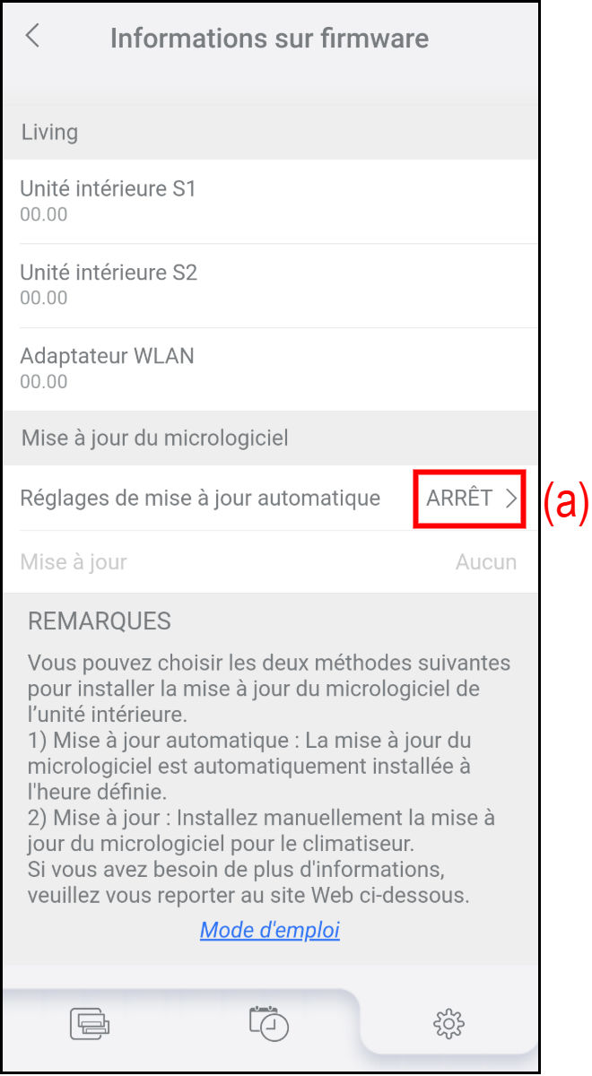 Vous pouvez configurer l'heure de démarrage de la mise à jour automatique du micrologiciel du climatiseur et de l'adaptateur WLAN.