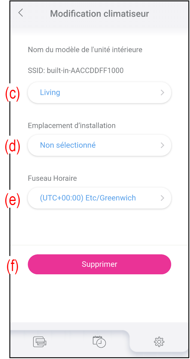(Le mode de contrôle peut être modifié dans « Réglage de l'environnement ».)(d) Emplacement d’installation Appuyez pour sélectionner l’emplacement d'installation du climatiseur. (e) Fuseau Horaire Appuyez pour sélectionner le fuseau horaire où le climatiseur est installé. La minuterie hebdomadaire et la minuterie faible bruit de l’unité extérieure fonctionnent selon ce réglage. (f) Bouton [Supprimer] Appuyez pour supprimer le climatiseur enregistré de votre compte. Si vous appuyez sur ce bouton, un message de confirmation s'affiche.