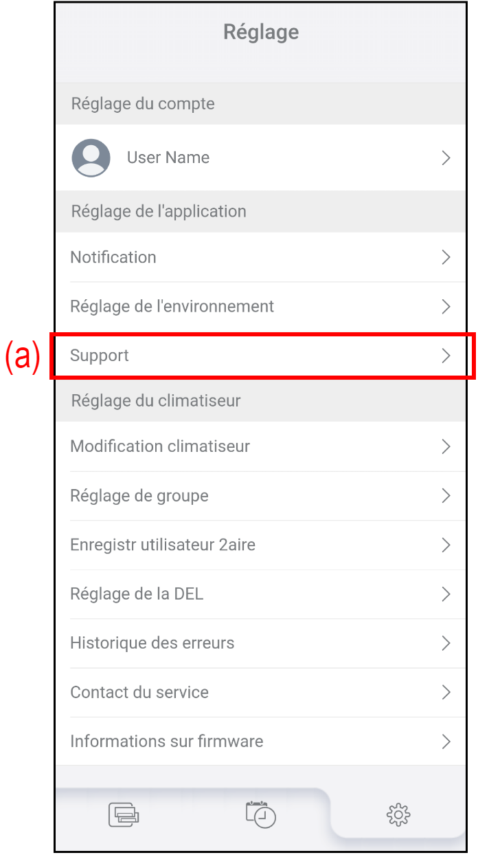 Appuyez sur (a) sur l'écran « Réglage » pour vérifier les informations de support.