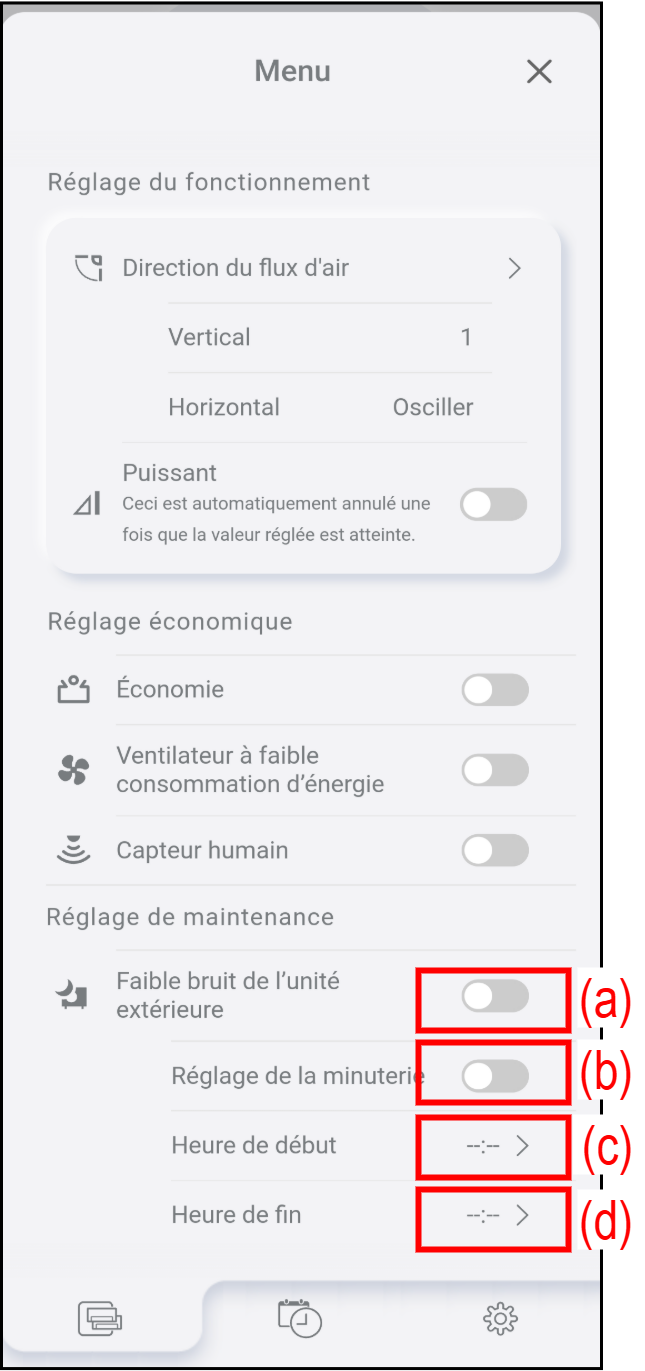 | (c) | Heure de début | Appuyez pour configurer l'heure de démarrage de la minuterie à faible bruit de l'unité extérieure. Le faible bruit de l'unité extérieure commence à l'heure configurée. |