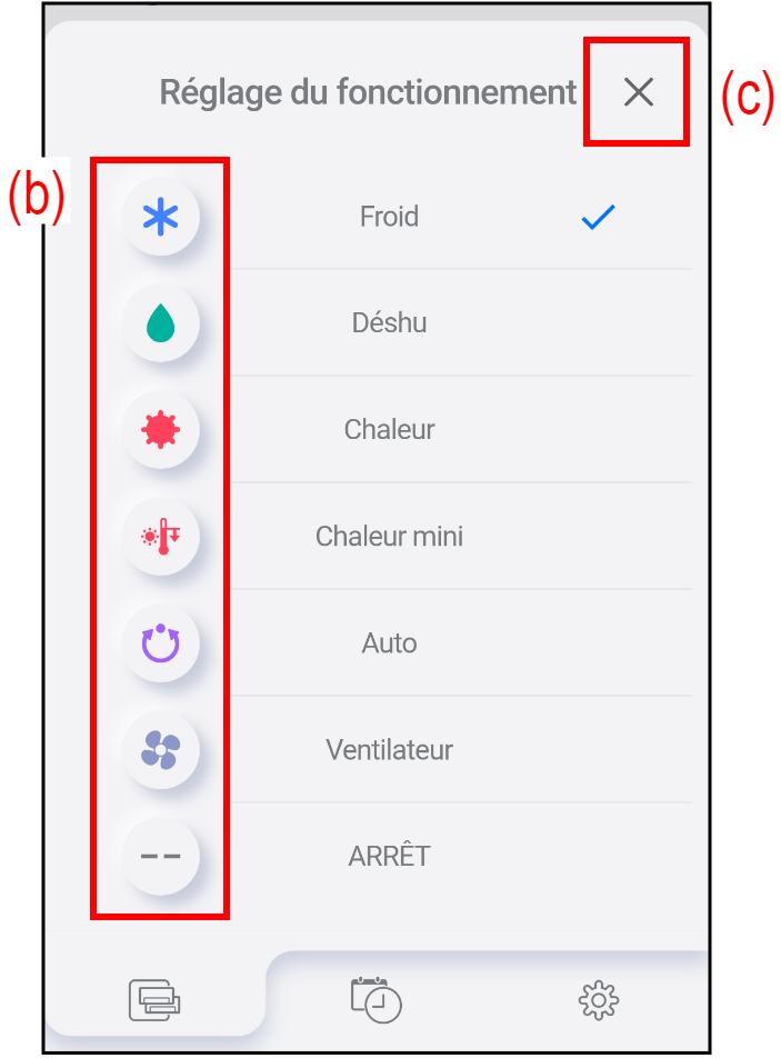 Appuyez sur l'icône (b) du mode de fonctionnement souhaité.