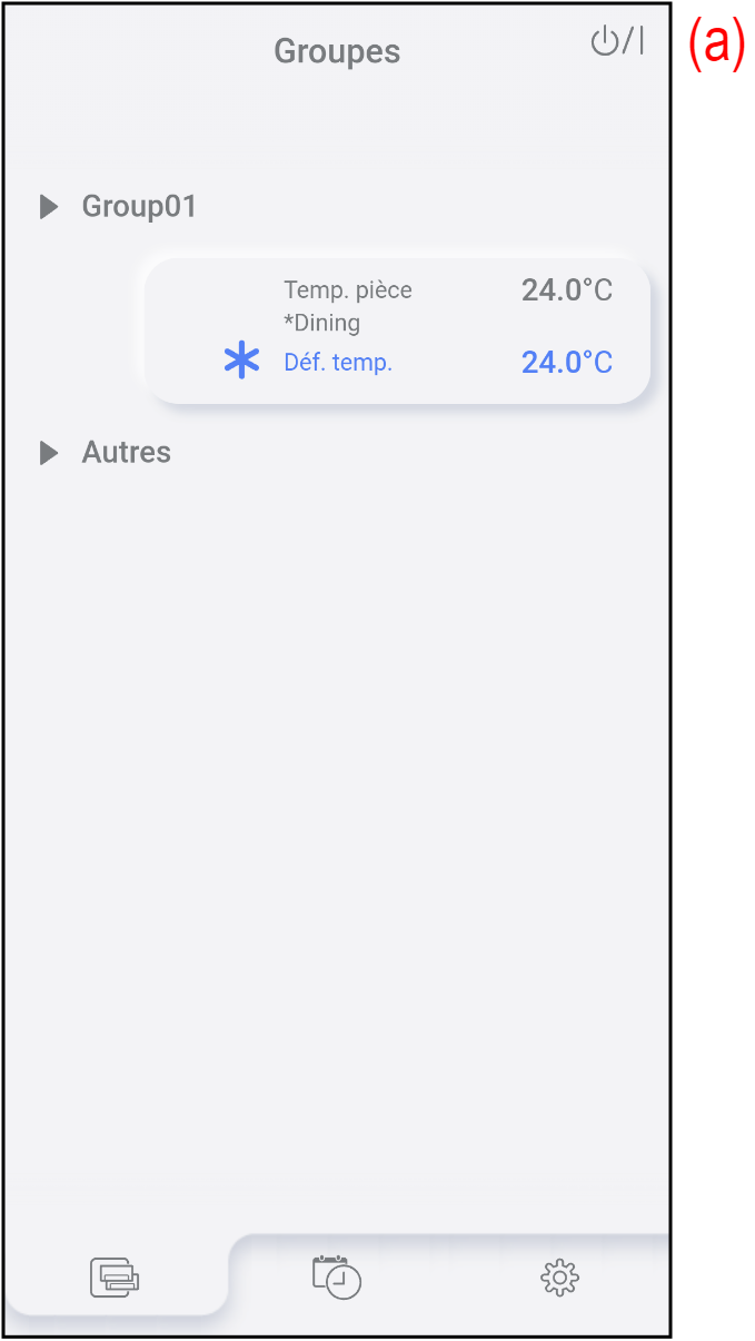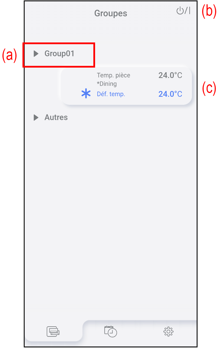 | (a) | Nom du groupe | Pour vérifier la liste des climatiseurs du groupe, appuyez ici. Consultez « Écran de liste de climatiseurs » pour plus de détails. |