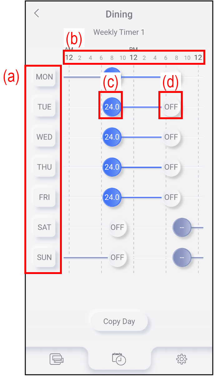 Zaslon prelazi na zaslon Timer Editing.Postavke tajmera možete kopirati iz jednog dana u tjednu u drugi. (Pogledajte „Kopiranje postavki tajmera“.)