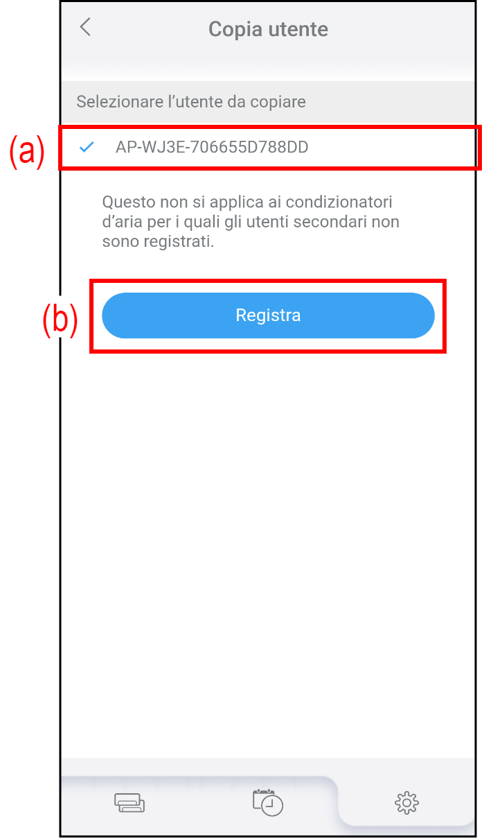 - Selezionare il condizionatore d’aria (a) dal quale si desidera copiare l’impostazione dell’utente secondario sulla schermata "Copia utente".