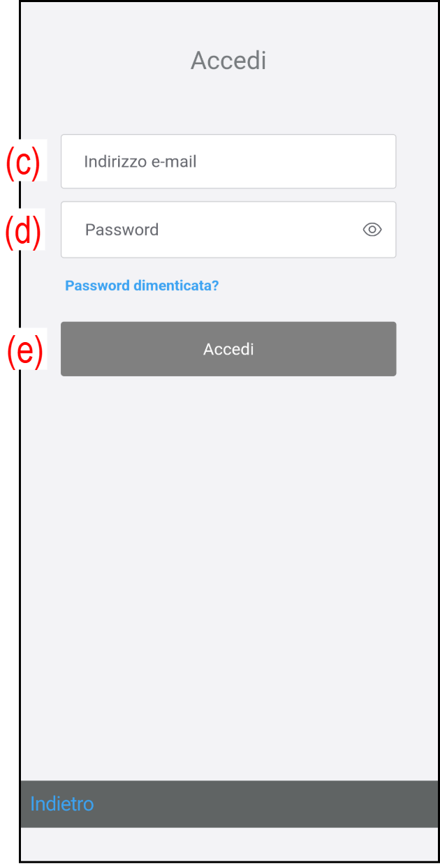 - Eseguire l'accesso con l'indirizzo e-mail (c) e la password (d) indicati in fase di registrazione.