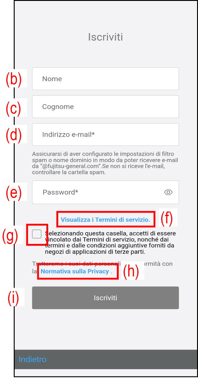 (b) Nome Inserire il proprio nome. (c) Cognome Inserire il proprio cognome. (d) Indirizzo e-mail Inserire il proprio indirizzo e-mail. Questo verrà utilizzato come ID account.