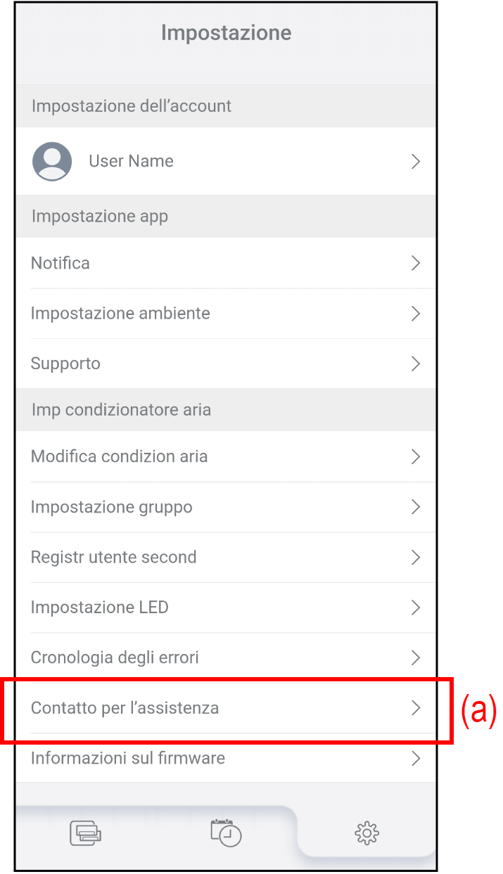 1. Toccare (a) sulla schermata "Impostazione" per verificare o modificare i dati sul Contatto per l’assistenza.