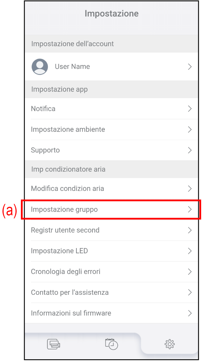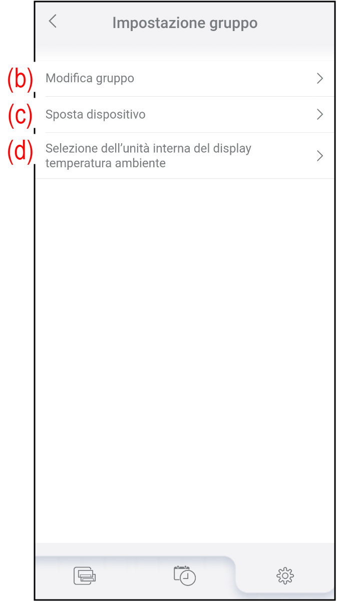 (b) Modifica gruppo Toccare per creare un nuovo gruppo, modificare il nome del gruppo o eliminare il gruppo. Fare riferimento a "Modifica gruppo" per informazioni dettagliate. (c) Sposta dispositivo Toccare per spostare i condizionatori d'aria a un altro gruppo.