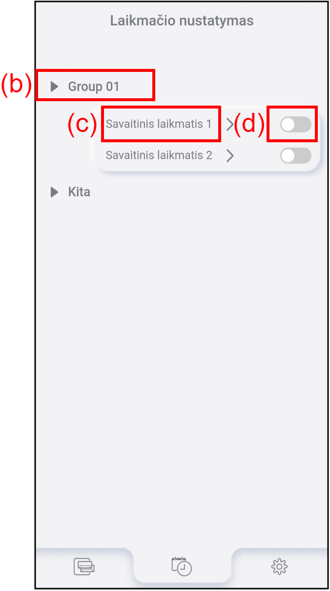 Norėdami įjungti arba išjungti savaitinį laikmatį, bakstelėkite (c).