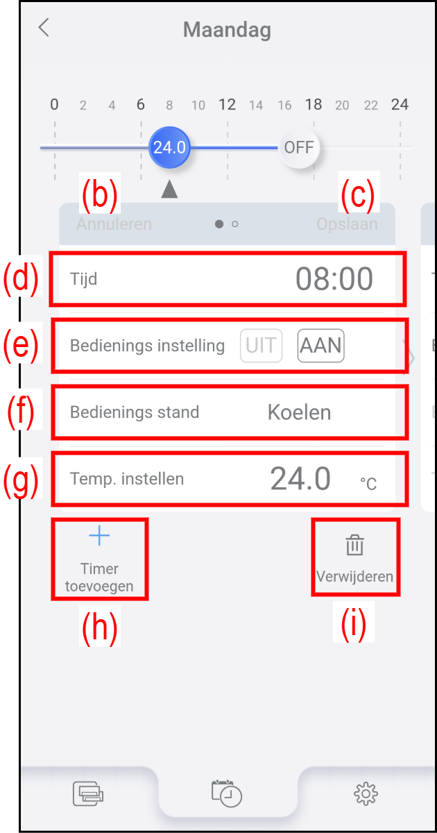 Tik op (h) om een nieuwe timer-instelling toe te voegen. Het Scherm Timer-bewerking voor de nieuwe timer verschijnt. Stel de timerinstellingen (d) tot (g) in en tik dan op (c) om de timerinstellingen op te slaan.