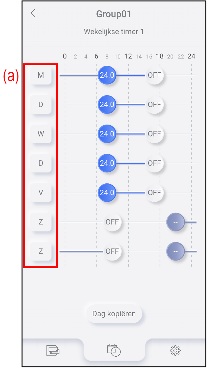 Tik op de dag van de week (a) waaraan u de timerinstelling wilt toevoegen of bewerk deze.