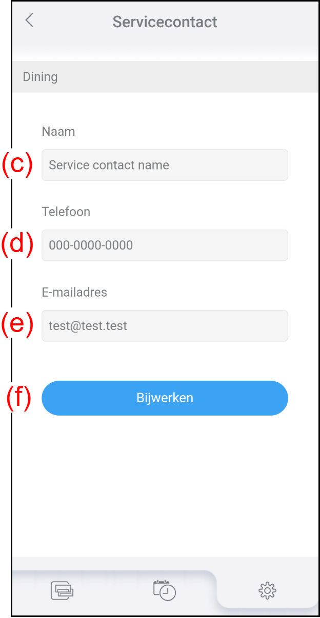 (d) Telefoon Voer het telefoonnummer van het servicepersoneel of het bedrijf in. (e) E-mailadres Voer het e-mailadres in van het servicepersoneel of het bedrijf.