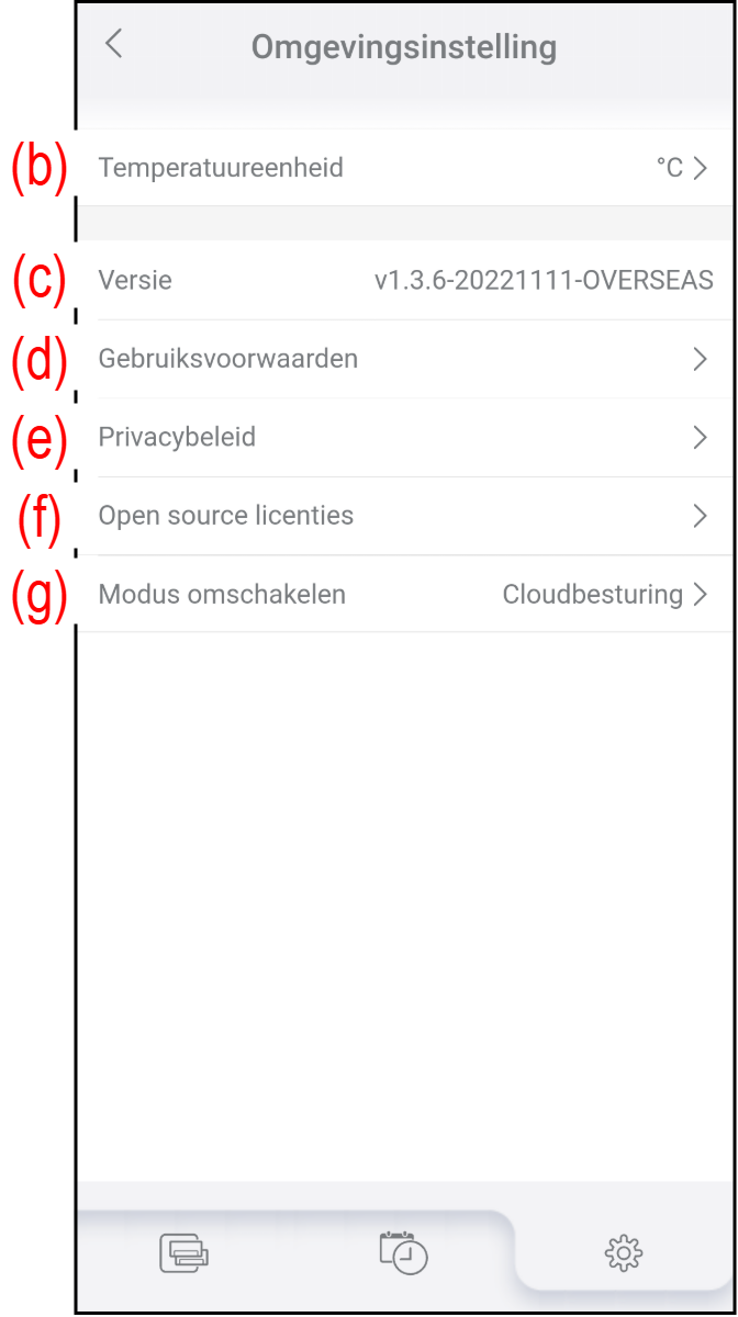 (c) Versie Het geeft de huidige versie van AIRSTAGE Mobile weer. (d) Gebruiksvoorwaarden Tik om de nieuwste Gebruiksvoorwaarden te bekijken voor AIRSTAGE Mobile. (e) Privacybeleid Tik om het nieuwste Privacybeleid van AIRSTAGE Mobile te bekijken. (f) Opensourcelicentie Tik om de opensourcelicenties gebruikt voor AIRSTAGE Mobile te bekijken. *De opensourcelicenties worden alleen in het Engels weergegeven. (g) Modus omschakelen Tik om de besturingsmodus te wijzigen (Cloudbesturing of Directe bediening.)