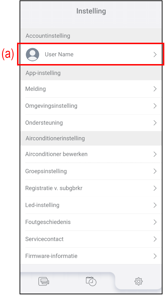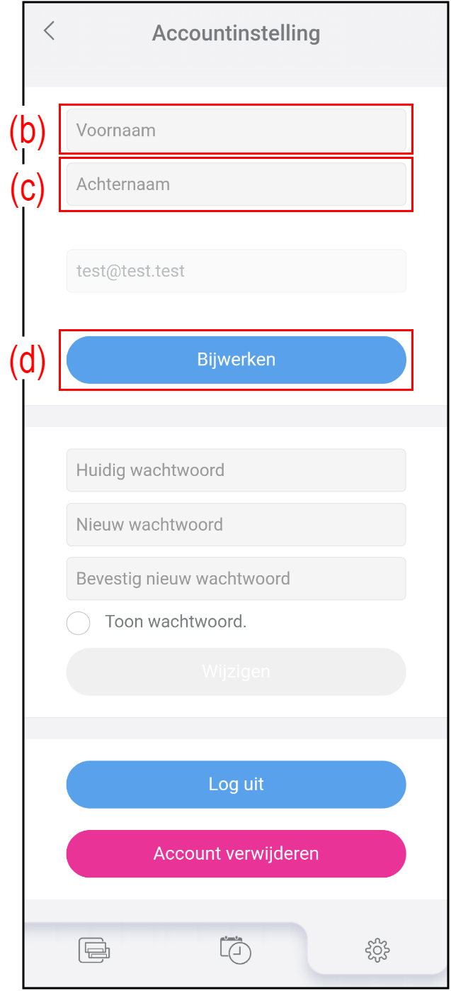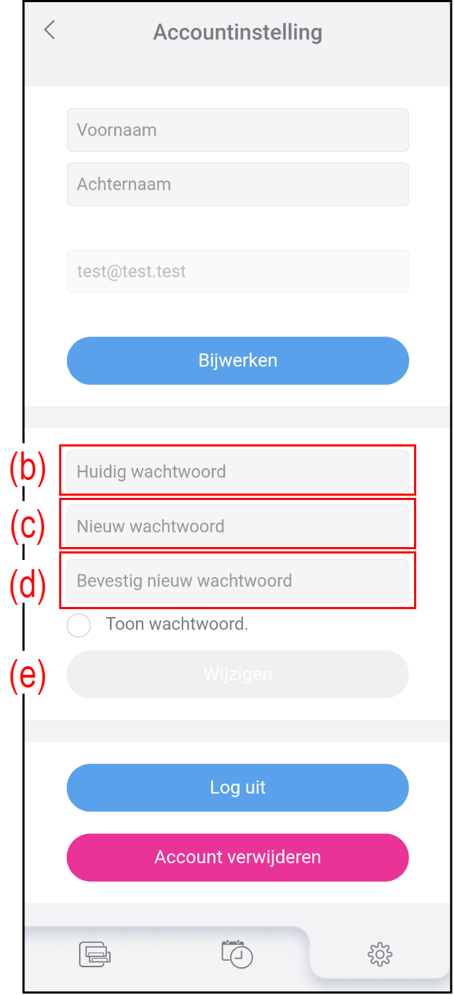 Tik op de knop (c) om uw account van deze app en AIRSTAGE Cloud-server te verwijderen.
