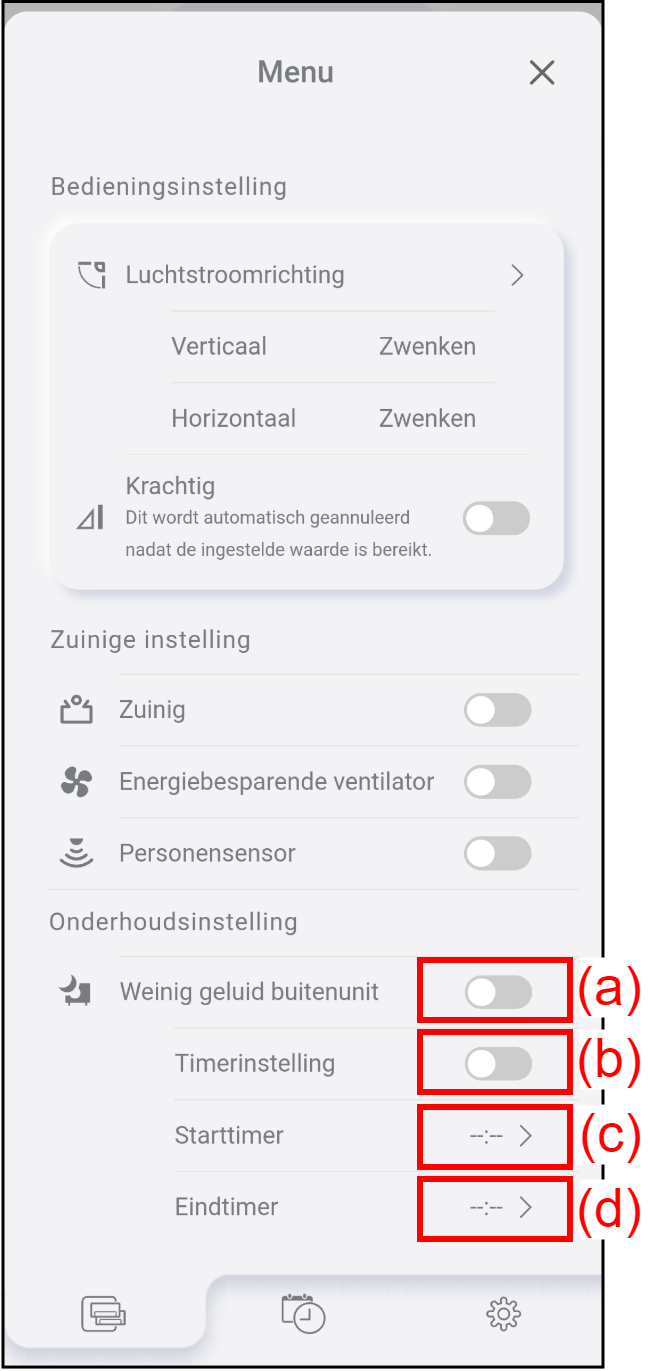 | (d) | Eindtimer | Tik op om de eindtijd van de timer Weinig geluid buitenunit in te stellen. De Weinig geluid buitenunit eindigt op de ingestelde tijd. |