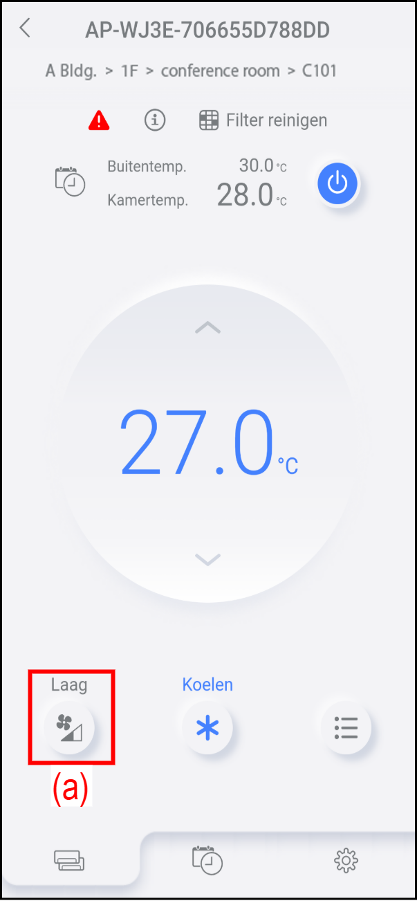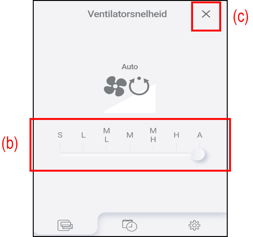 Tik op (a) om de ventilatorsnelheid te wijzigen.