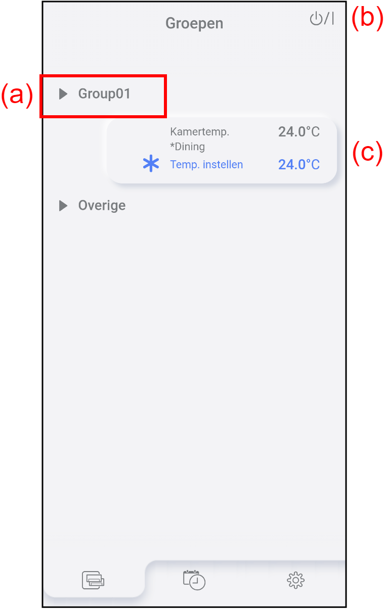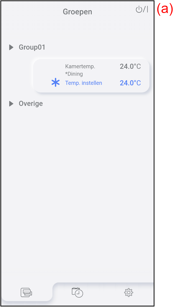 | (c) | Huidige status | Het geeft de huidige status van de groep weer. Tik hier om alle airconditioners in de groep te bedienen. Raadpleeg "Bedieningsinstelling voor de groep" voor informatie. |