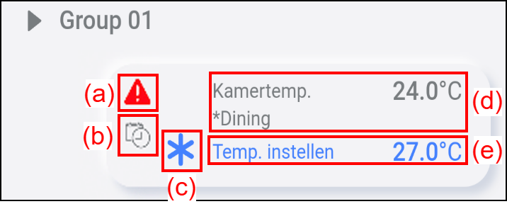 | (d) | Kamertemp. | Het geeft de representatieve binnenunit en de door de representatieve binnenunit gemeten kamertemperatuur weer. U kunt de representatieve binnenunit instellen via het tabblad Instellingen > "Groepsinstelling" > "Room temperature display indoor unit selection". |