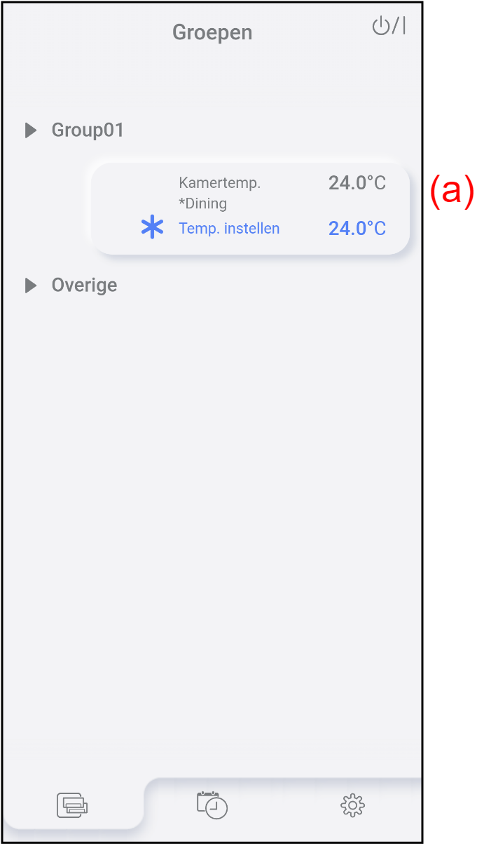 * In de modus Ventilator en Minimale warmte is deze niet beschikbaar.(d) Bedieningsstand Om de besturingsmodus te selecteren, tik hier. - Tik op (e) om het venster te sluiten.