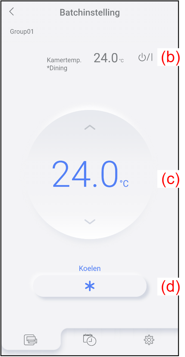 (b) Start/stoppen Om de bewerking te starten/stoppen, tikt hier. (c) Temperatuur instellen Om de ingestelde temperatuur te wijzigen, tik op[