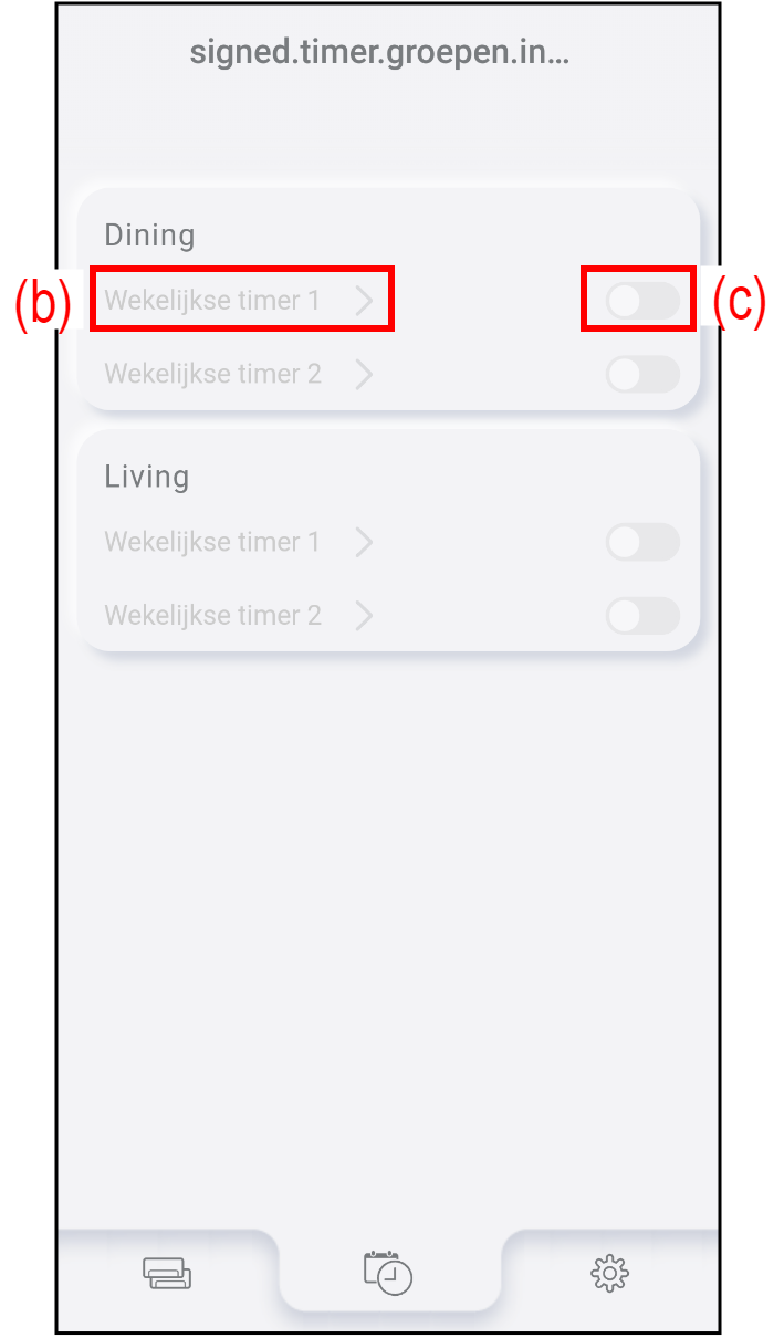 Tik op (c) om de Weektimer te activeren/deactiveren.