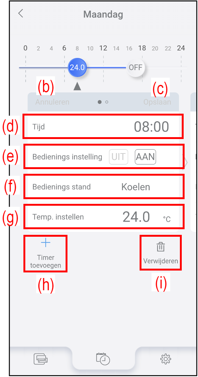 Tik op (h) om een nieuwe timer-instelling toe te voegen. Het Scherm Timer-bewerking voor de nieuwe timer verschijnt. Stel de timerinstellingen (d) tot (g) in en tik dan op (c) om de timerinstellingen op te slaan.