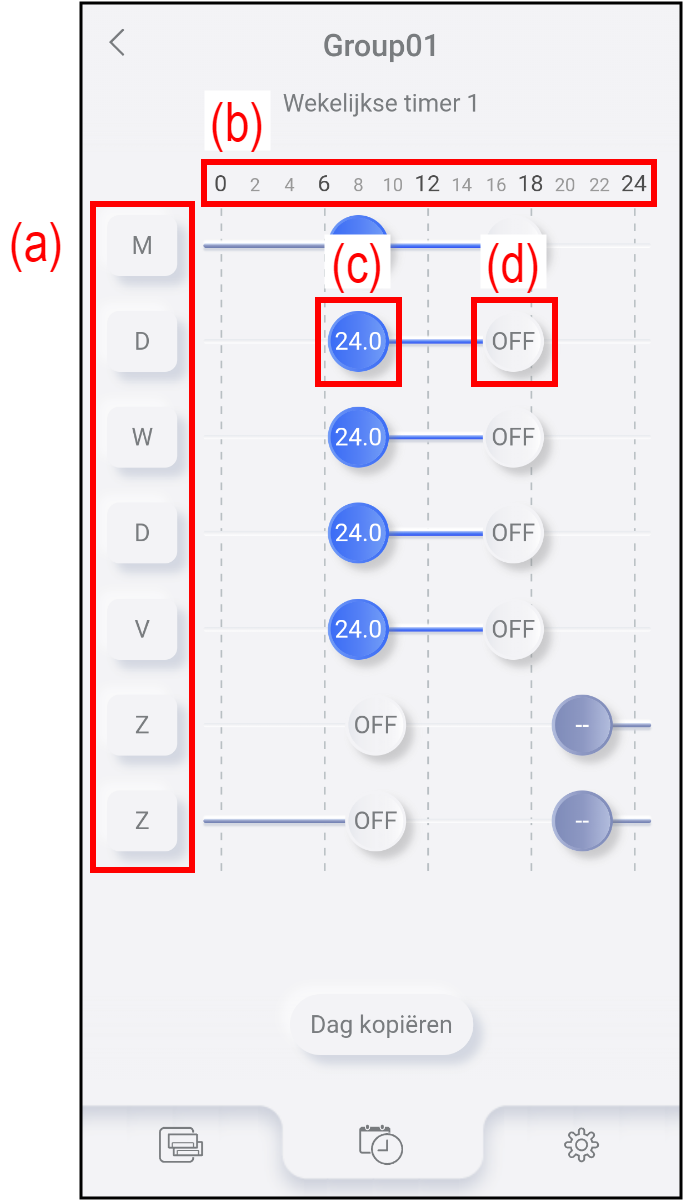 Het scherm gaat naar het scherm Timer-bewerking.U kunt de timerinstellingen van een dag van de week kopiëren naar een andere dag. (Raadpleeg "Kopiëren van de timerinstelling".)