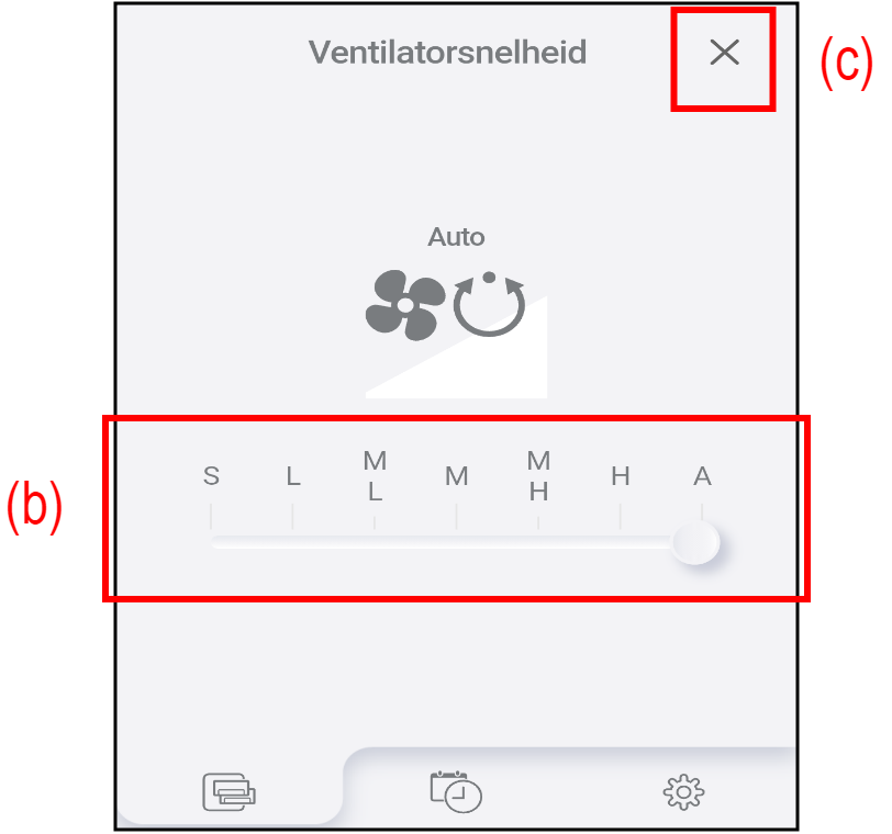Tik op (a) om de ventilatorsnelheid te wijzigen.