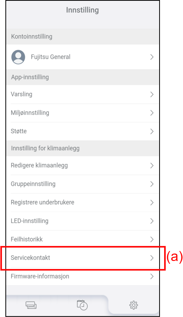 - Trykk på (a) på «Setting»-skjermen (Innstilling) for å sjekke eller redigere informasjonen om servicekontakt.