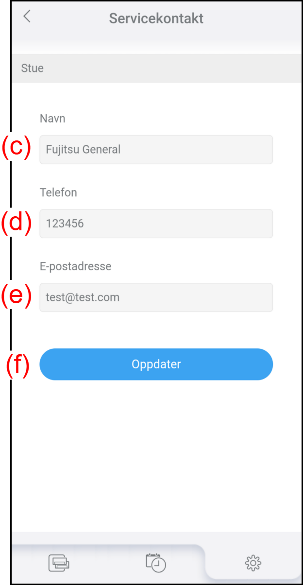 (d) Phone Skriv inn telefonnummeret til servicepersonell eller til bedriften. (e) E-mail address Skriv inn e-postadressen til servicepersonell eller til bedriften.
